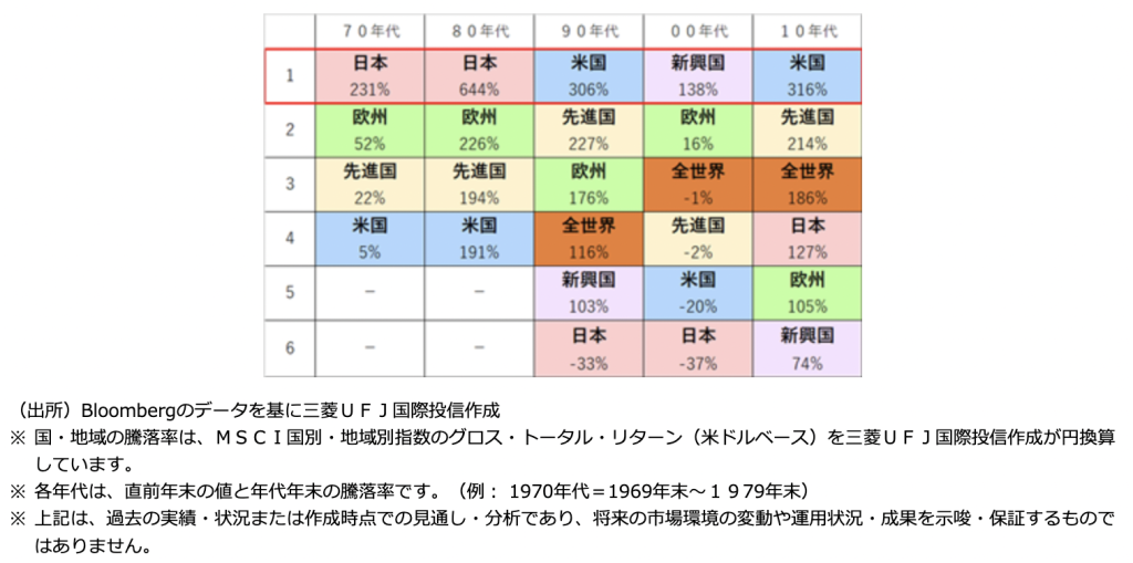 ここ最近は米国の圧倒的な強さが目立ちますが、強い国・地域は移り変わってきているんですね。とても興味深いです。若い方はそもそもご存知ないかもしれませんし、僕自身忘れていましたが、1970-80年代はなんと日本がトップだったのです。その後米国がトップになるも、2000年代は急落して新興国がトップに。これはリーマンショックの頃ってことでしょうか?それでも2010年代には米国が復活して今に至るということらしいです。つまり、今は米国が強いが、いつまでも米国が強くい続けるという保証はどこにもない、ということが歴史からわかります。たしかにここ数年、米国株はとても調子がいいけれども、もはや米国経済はバブルだという人もいます。インドが来るぞという話もチラホラ聞きます。中国が電気自動車で世界を席巻しちゃうかもしれないし…。投資に興味をもってから、いろんな経済の話が飛び込んでくるようになって、それはそれでおもしろいのですが、とはいえ素人の浅い知識なので、かえって悩んでしまうという状況に。うーむ…。