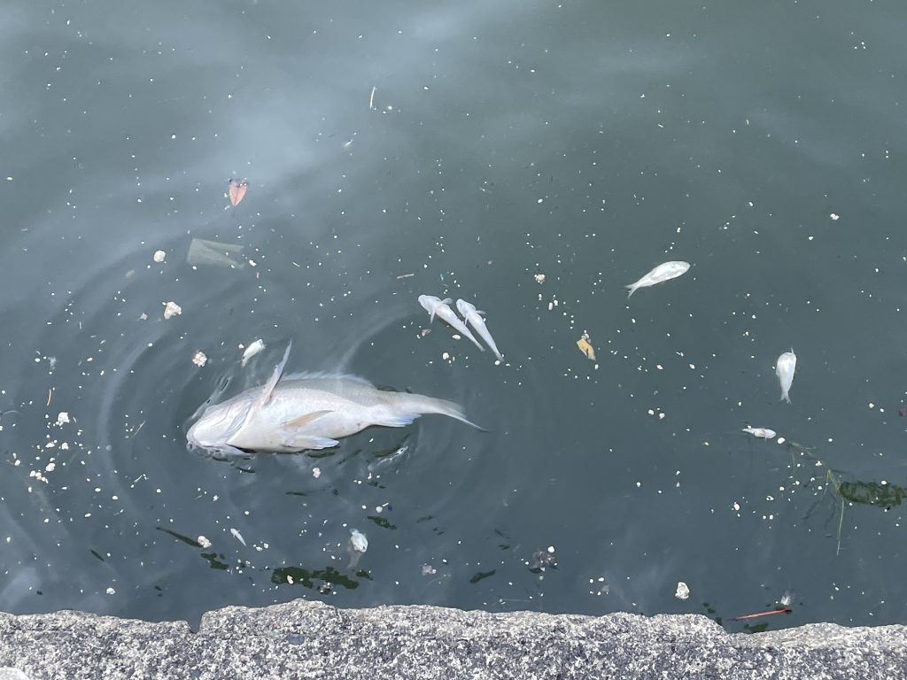 9/7の早朝。状況が改善していることを祈って運河へ。するとおびただしい数の魚の死骸が浮いています。一番多いのはハゼ。次にコノシロと小さなスズキ。たまにカマス。そしてときおり、大型のクロダイやスズキの死骸も浮いていました。いつも釣りをしている運河が、腐敗臭漂う死の河に。移動能力の低いハゼが死んでしまうのはある程度想定していましたが、泳力の高いクロダイやスズキまで死んでしまっていることに驚きました。おそらく広大なエリアが酸欠状態になり、酸素がある海に脱出できなかったクロダイやスズキまで犠牲になってしまったのでしょう。運河という人工河川の厳しさを目の当たりにしたのでした。