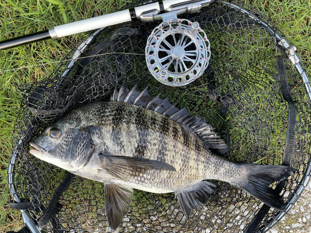エサは、ここ数回のあたりエサである、黒鯛メロメロフジツボです。ところで、この公園はジョギングしている人が多いですね。日中よりも人通りが多いのではないかと思うくらいのランナーたちの往来を横目に、上げたり下げたりを繰り返します。満潮からの下げ4分あたりで、落下中にひったくるようなアタリ。タナは2.5〜3メートルくらい。昨日とほぼ同じ深さです。グングンと横に走るのに合わせて僕も横に歩くのですが、あ、このまま行くとハシゴがある!あそこに潜られたらラインブレイクしてしまう!ということでやや強引に浮かせて取り込みました。