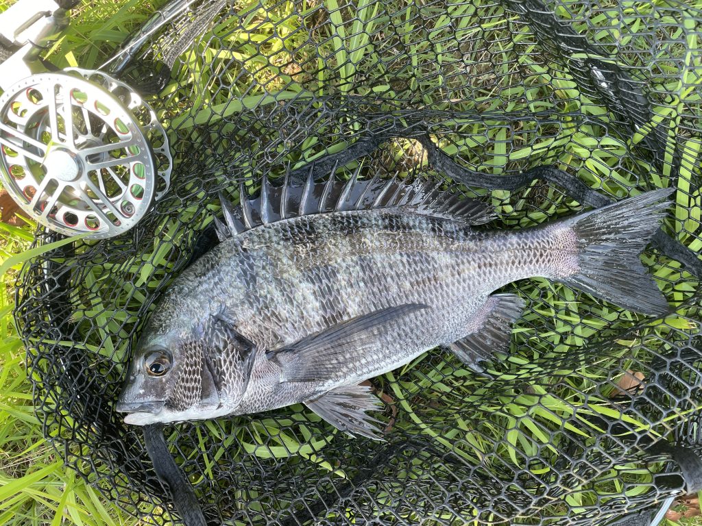 タナは底付近だったと思います。ゴン!と力強いアタリ。ぐるり公園では割と浅いタナで釣れることが多いため、こんな深いところで来るんだと意外な気がしました。何度もオーバーハングに潜り込まれそうになり、その度にやめてー!と思いながら手を伸ばしてロッドを沖に向けて岸壁から引き離す。ナイスファイトの末に上がってきたのは、34センチのキレイなクロダイでした。ハリはカンヌキにしっかりかかっていました。カンヌキにかかると、自分の合わせ方が良かったのかもと思えてうれしいですね。なんとか1枚釣って満足した僕は、ダブルヘッダーで少し疲れていたのもあり、それ以上粘らずに帰宅しました。初戦でボウズを喰らい、2戦目でなんとか結果を出すというハードな日でしたが、達成感あり。ここがダメならあそこに行ってみようというように、場所のオプションをいくつか持っておくといいのかもしれませんね。最後までお読みいただき、ありがとうございました。