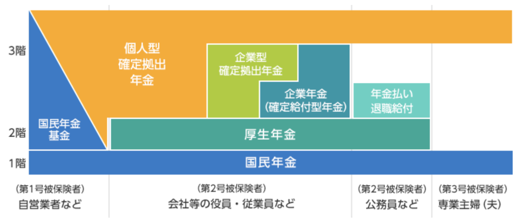 確定拠出年金とは一言でいうと「60歳から引き出せる、自分で運用して育てる年金」です。企業型と個人型があり、僕がやっていたのは「企業型確定拠出年金(企業型DC)」でした。個人型のほうはいわゆる「iDeCo」です。「国民の高齢期における所得の確保のための、自主的な努力を支援する」という目的のもと、2001年10月から個人型確定拠出年金が、2002年4月から企業型確定拠出年金が施行されました。企業型は、毎月積み立てる掛金を企業が負担(拠出)してくれて、従業員自身が投資先を決めて運用していきます。国民年金(日本に住む20歳以上60歳未満の全員が加入)や厚生年金(公務員や会社員などが国民年金に上乗せして加入)とは違い、「自分で投資先を選ぶ」ところが特徴です。