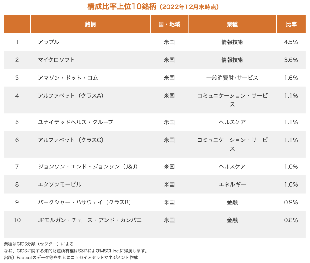 会社の確定拠出年金で選べる投資先の中には「S&P500」や「オールカントリー」が入っていませんでした。ちょっと残念。そのなかで僕が選んだのは「MSCI-KOKUSAIインデックス」を採用しているファンドです。MSCI-KOKUSAIインデックスは、MSCI が開発した、日本を除く先進国22カ国に上場する大・中型株約1,300銘柄で構成された指数。分散という観点でいえば、米国に集中するS&P500と全世界に分散するオールカントリーの中間というところでしょうか。構成比率上位の銘柄を見ても、基本的にはS&P500やオールカントリーとほぼ同じですね。そういう意味で安心感があります。
