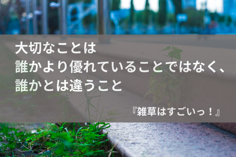 小島よしおさんの最近のFacebookを見ていると、たびたび『雑草はすごいっ!』という本を紹介されています。どうやら、雑草の生存戦略に小島よしおさんが学ぶところが多くあり、植物学者の稲垣栄洋先生と共著で出版された本のようです。これは読むしかない!と思い、購入して読んでみました。先に結論を書くと、悩める経営者・悩める管理職・悩める中堅・悩める若手・悩める新人、つまりすべての社会人は読むべき本だと思いました。もちろん自分もその一人です。「マーケティング」「自己啓発」「生き方・働き方」など、いろんなビジネス書を10冊読むよりも得るものがあると、個人的に感じました。どの辺がすごいと思ったのか、書き出すと本のすべてをここに書いてしまいそうなので、それは控えますが、僕が特に心に響いた言葉を3つだけ選んでご紹介します。響く言葉は人それぞれだと思うので、ぜひお読みいただき、ご自分に響く言葉を探してみることをおすすめします。